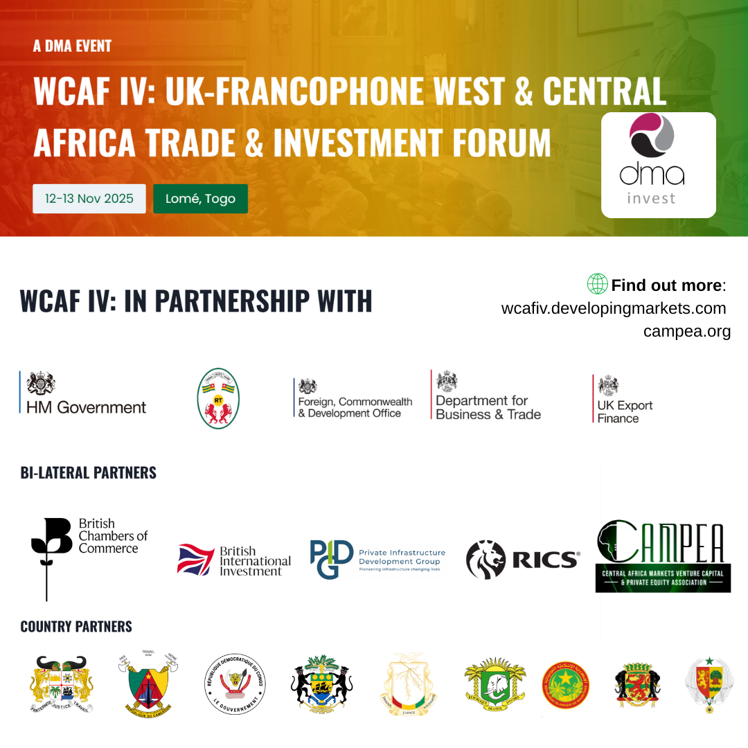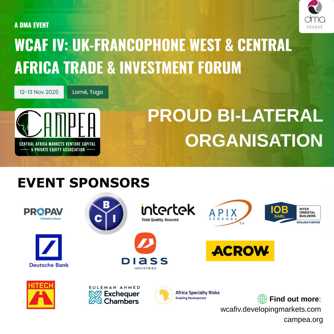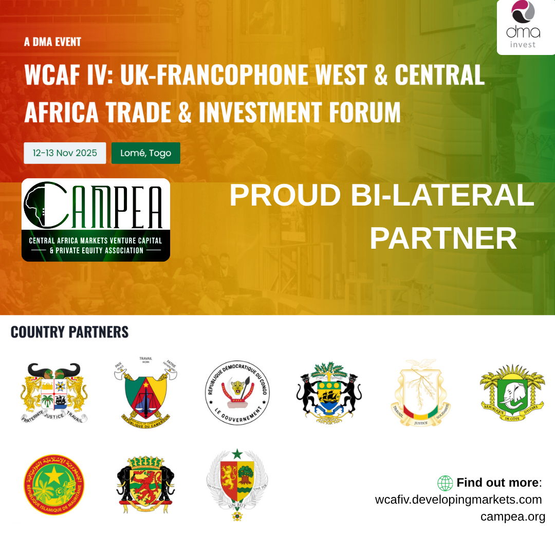 London, 18th October 2025 – Poised to position Central African/Pan-African fund managers at the forefront of the UK–Africa investment corridor: CAMPEA is delighted to confirm its role as an official bilateral partner of the UK Government-sponsored United Kingdom Francophone West & Central Africa Trade & Investment Forum (WCAF IV), the two-days long summit organised by UK- based Developing Markets Associates (DMA Invest) will be taking place on the 12th and 13th November 2025 (see link for general registrations).